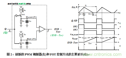 我们采用PSIM 仿真法在不同的拓扑(例如,DC/DC降压COT、PFC升压FOT、DC/DC反激式FOT转换器等)内测试并验证图2所示调制器。