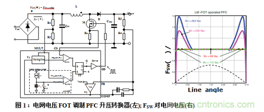 例如,用FOT方法控制CCM PFC前级升压稳压器,导致开关频率随电网电压和负载条件而发生明显变化[1]。按照实时电网电压调制关断时间,可以降低开关频率(TOFFKt Vin, pksinθ), 如图1所示,只要升压级是CCM模式,最终开关频率是恒定的[2],如图1右图所示。