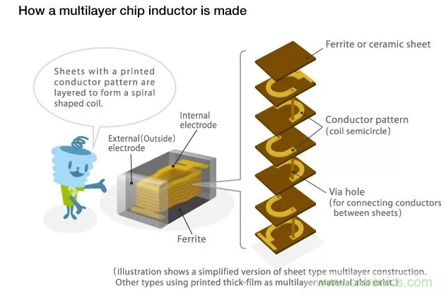 多层片状电感的制作工艺:将铁氧体或陶瓷浆料干燥成型,交替印刷导电浆料,最后叠层、烧结成一体化结构(Monolithic)。