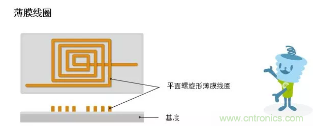 薄膜电感采用的是类似于IC制作的工艺,在基底上镀一层导体膜,然后采用光刻工艺形成线圈,最后增加介质层、绝缘层、电极层,封装成型。