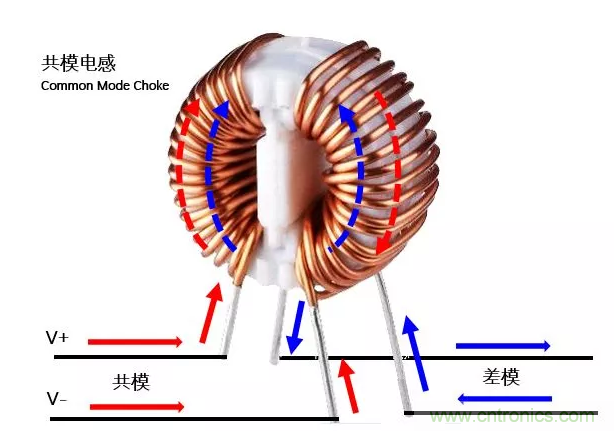 当有差模成分流过共模电感时,根据右手定则,会在两个线圈形成方向相反的磁场,相互抵消,相当于对差模信号存在较低的感抗。