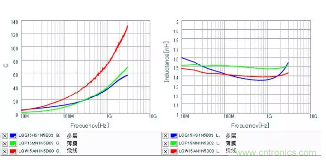 Murata有三种工艺的高频电感,选择了同感值(1.5nH)、同封装、同容差的电感对比。