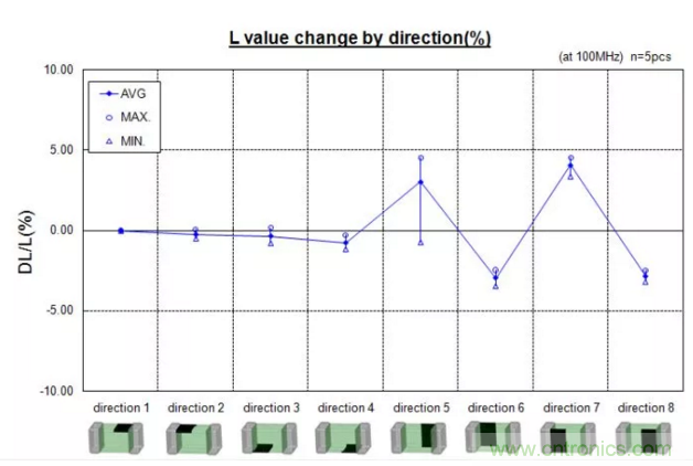 可以看出,标记点朝侧面,感值变化较大,所以贴片时应注意让电感上的标记点朝上。