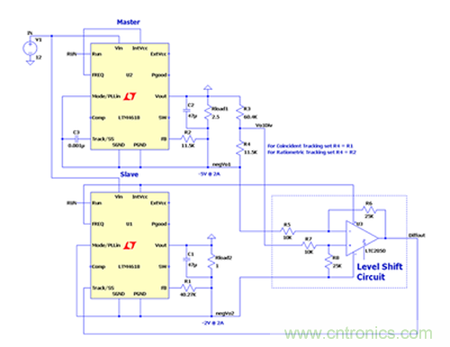 TRACK引脚输入允许μModule稳压器通过将跟踪信号(即,主μModule稳压器的输出电压轨的分压版本)提供给从μModule稳压器的TRACK引脚来跟踪另一电源轨的输出电压斜坡。每个μModule稳压器内部控制器所看到的TRACK引脚电压与其μModuleGND引脚相关,但在需要配置两个负输出转换器进行跟踪的应用中,μModule稳压器的GND引脚可以处于不同的电位。主和从GND引脚电位差异意味着主设备提供的跟踪信号不能直接施加到从设备的跟踪引脚。在这些类型的应用中,需要额外的考虑以确保从机相位能够看到来自主机相位的正确参考的跟踪信号。