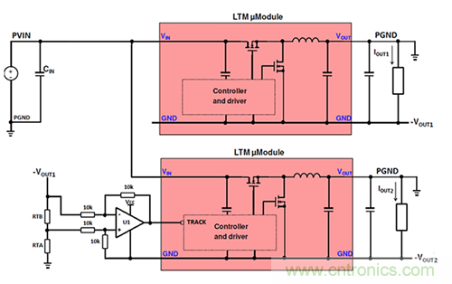 μModule稳压器的GND引脚现在变为负输出电压轨(-V OUT)。负载连接在负输出和PGND之间。