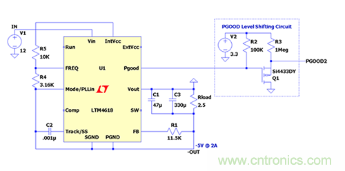 下面举例说明在负输出配置中使用LTM4618时PGOOD引脚电平转换电路的设置。V IN = 12V,-V OUT = -5V @ 3A。