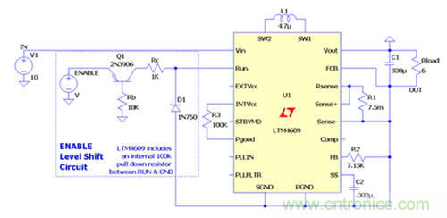 图4显示了LTM4609在负输出配置中使用的RUN引脚电平转换电路的设置。V IN = 10V,-V OUT = -12V @ 2A。