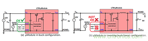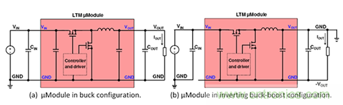 图1.仅仅几个连接变化将一个降压μModule稳压器(a)转换为一个负输出稳压器(b)
