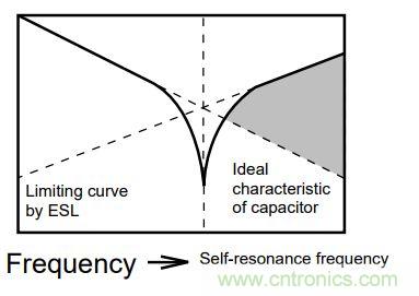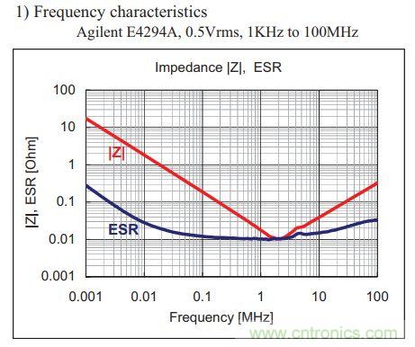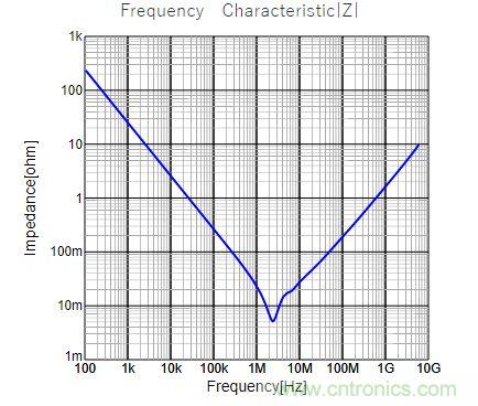 MLCC有经典的V型阻抗-频率曲线。随着频率升高,寄生电感的影响开始凸显,阻抗先变小再变大,这是MLCC的固有特性。曲线中的最低点就是MLCC的自谐振频率。