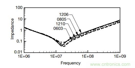 一般来说,直插件的引线较长,其寄生电感比SMD大;电解电容内部有大量卷绕结构的铝箔,寄生电感比其它工艺的电容大。1206尺寸的MLCC内部电极面积和焊接端子截面明显比0805大,所以尺寸越大的MLCC,自谐振频率就越低。