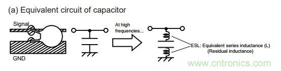 RLC电路中,当系统阻尼R提供的衰减不足时,容抗和感抗相互抵消,能量在LC间来回传递,这就是"谐振"。直插电容的引线、MLCC内部高密度金属电极和焊接端子都能提供少量的寄生电感(Parasitic Inductance),这是分立电容元件"自"谐振的根本原因。
