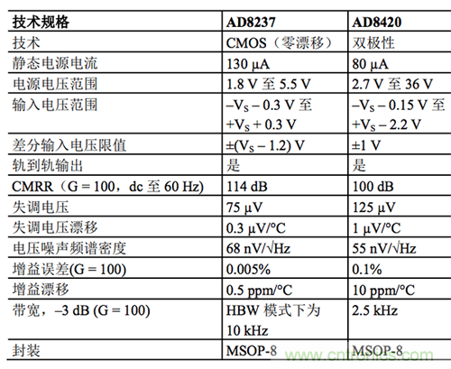 表 2 是对两款仪表放大器进行了比较。都使用了最小和最大规格。有关更多详情和最新信息,请参见产品数据手册。
