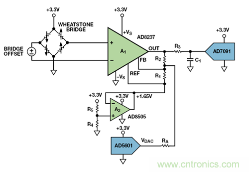 这个问题可通过图 5 所示的电路来解决。电桥放大器A1是一个像AD8237 一样的ICF仪表放大器。放大器A2,带R4 和R5,将A1的零电平输出设为中间电源。AD5601 8 位DAC对输出进行调整,通过RA使电桥失调为 0。然后,放大器的输出由AD7091微功耗 12 位ADC数字化。