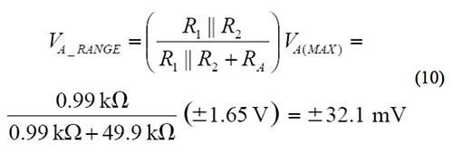由于 DAC 可以摆动±1.65 V,因此,总失调调整范围可通过由 RA以及 R1和 R2的并联组合形成的分压器给定,其计算方法如下: