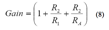 其中,VIN(MAX)为传感器预期的最大失调。等式(5)同时显示,调整电路的插入会修改从输入到输出的增益。即使如此,其影响一般也很小,增益可以重新计算为: