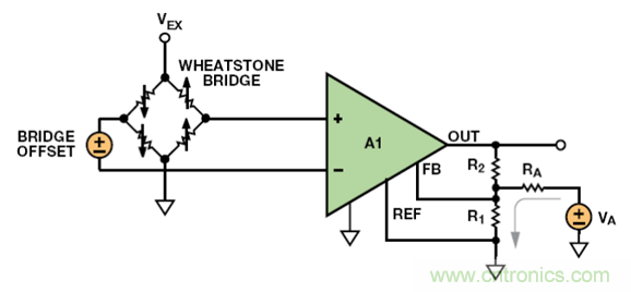 例如,在各元件的容差均为 0.1%且激励电压为 5 V 时,差分失调可以高达±5 mV。如果需要 400 的增益来实现所需电桥灵敏度,则放大器输出端的失调变成±2 V。假设放大器由同一电源驱动,并且其输出可以轨到轨摆动,则仅电桥失调就可能消耗掉 80%以上的输出摆幅。在行业要求电源电压越来越小的趋势下,这个问题只会变得更加糟糕。