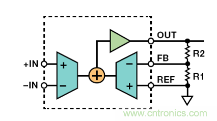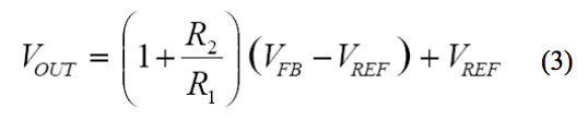 由于输入之间的电压等于反馈(FB)与参考(REF)端子之间的电压时,放大器的反馈要求可得到满足,因此,我们可将该公式重写为