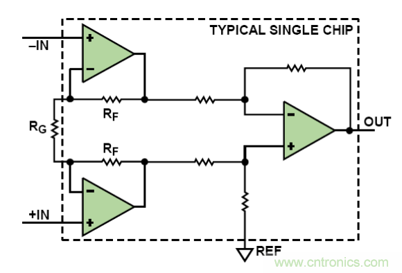 传统的三运放仪表放大器架构(如图 2 所示)有一个差分增益级,其后为一个减法器,用于移除共模电压。增益施加于第一级,因此,失调放大的倍数与目标信号相同。因此,将其移除的唯一方法是在参考(REF)端施加反电压。这种方法的主要不足在于,如果放大器的第一级已经饱和,则调节 REF 上的电压并不能更正失调。克服这点不足的几种方法包括: