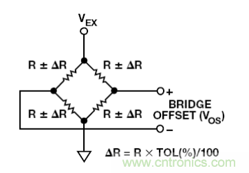 惠斯登电桥是这种情况的经典例子,但像生物传感器一类的原电池具有类似的特性。电桥输出信号为差分信号,因此,仪表放大器是高精度测量的首选。理想情况下,无负载电桥输出为零,但仅当所有四个电阻均完全相同时,这种情况方为真。假如有一个以分立式电阻构建的电桥,如图 1 所示。最差情况差分失调 VOS 为: