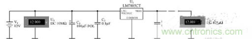 对图2 所示的电路进行仿真,其中电容C1、C2、C3的容量分别为100μF、0.1μF、0.1μF,输入+12V的直流信号,使用两个电压表来观察输入/输出的结果。