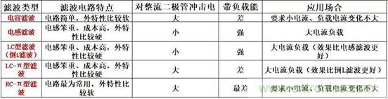 在输出端并联一个电容,这种电路较为简单,只有一个一般比较大的电解电容,输出电压随着输出电流变化而变化,外特性比较软,输出特性很差,因此适用于负载电流变化不大的电路,同时负载电流不是很大的场合;为了减少脉动成分,有时候会并联一大一小的电容。