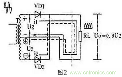 全波整流则是要用到二个二极管,ASEMI工程上也会要求需要有带中心抽头的两个次级线圈,这两个次级线圈需要圈数相同,以保证相同的电阻。详细的情况我们可以看下图2,负载RL得到的就是全波整流电流,输出电压比半波整流电路要高。