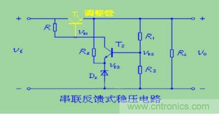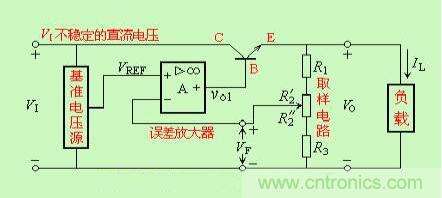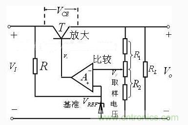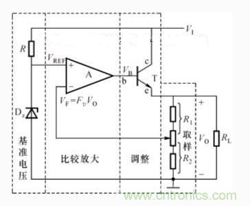 VI是整流滤波后的电压,T为调整管,A为比较放大电路,VREF为基准电压,它由稳压管Dz与限流电阻R构成。R1与R2组成反馈网络,是用来反映输出电压变化的取样环节。