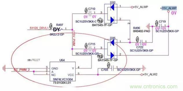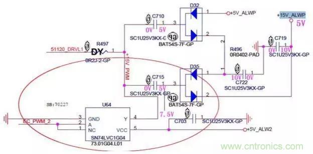 2.同时,C710的电压为左边0V,右边5V,C722的左端电压为7.5V,由于D32的2引脚的反向截止,C722依然不会对C710充电,C722保持在7.5V。