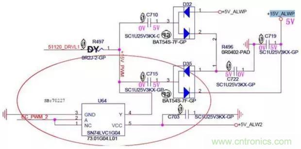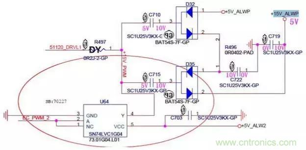当通电时,右上角+5V_ALWP通过D32的1引脚对C710、C722、C715、C719进行充电,此时电容上两端的电位如上图所示。此时+15V_ALWP输出端口的实际电平为5V。