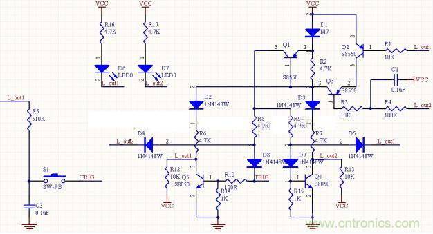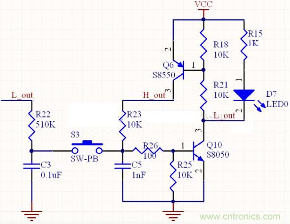 利用Q10的输出与输入状态相反(非门)特性和电容的电流积累特性。刚上电时Q6和Q10的发射结均被10K电阻短路所以Q6和Q10均截止,此时实测电路耗电流仅为0.1uA,L_out输出高,H_out输出低。此时C3通过R22缓慢充电最终等于VCC电压,当按下S3后C3通过R26给Q10基极放电,Q10迅速饱和,Q6也因此饱和,H_out变为高电平,当C3放电到Q10be结压降0.7V左右时C3不再放电,此时若按键弹开C3将进一步放电到Q10的饱和压降0.3V左右,当再次按下S3,Q10即截止。