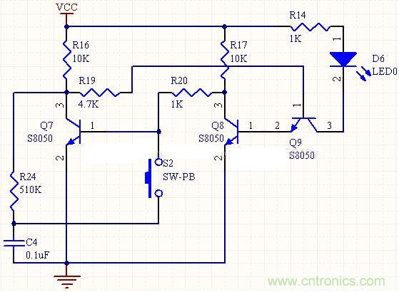 这个电路可以完美解决按键抖动和长按按键跳档的问题,开关状态翻转只发生在按键接触的瞬间,之后即便按键存在抖动或长按按键的情况开关状态不会受到影响。这是因为R22的电阻很大(相对R23,R26,R25)当C3电容的电压稳定后,R22远不足以改变Q10的开关状态,R22要能改变Q10的状态必须要等S3弹开后C3将流过R22的小电流累积存储,之后再通过S3的瞬间接触快速大电流释放从而改变Q10的状态。