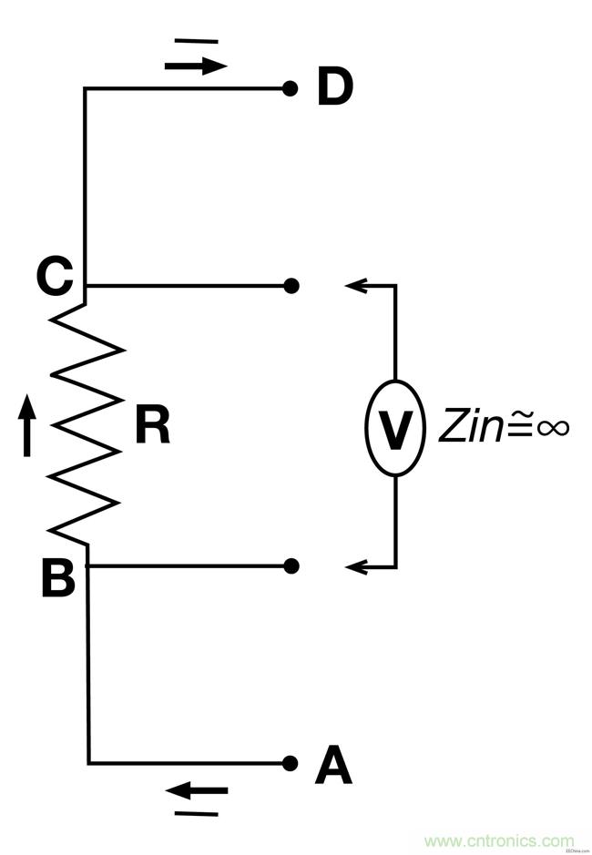 原则上借助电阻(“R”)和相应的压降(“V”,从B到C)来测量电流(I,从A到D)是非常简单的,但是有一些细小的问题要承认,当电流很高而且电阻阻值为100 mΩ或者更低时我们要采用四线高阻抗开尔文感应检测法则。