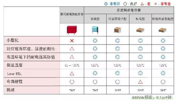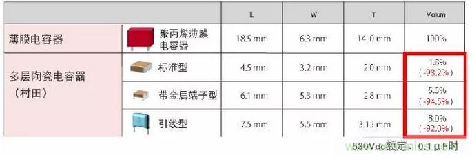 多层陶瓷电容器和薄膜电容器同一电压、同一容量的比较表。可知多层陶瓷电容器非常小型化。