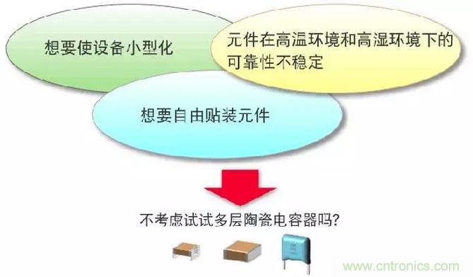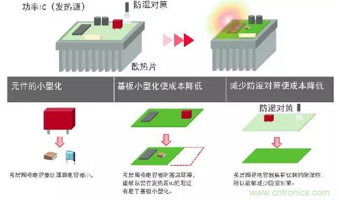 选择多层陶瓷电容器,元件的小型化、元件贴装位置自由度的提高使基板具有小型化和由于优越的耐湿性,而减少防湿对策的优势。