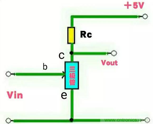 这里假定图中的三极管是一个NPN型三极管,其c-e两极之间的电阻可以视为一个受输入信号控制的压控电阻。Vin为加在三极管be结(发射结)的输入信号电压,Vout为三极管集电极的输出电压。