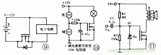 一种简单的触摸调光电路如图10。当手指触摸上触头时,电容经手指电阻及100k充电,VGS渐增大,灯渐亮;当触摸下触头时,电容经