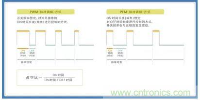 图2:PWM(脉冲调幅)方式与PFM(脉冲调频)方式