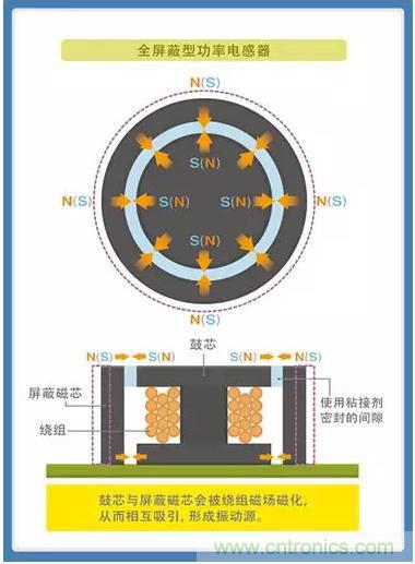 当电感器附近存在屏蔽罩等磁性体时,磁性体会因电感器漏磁通影响产生振动,从发生啸叫。