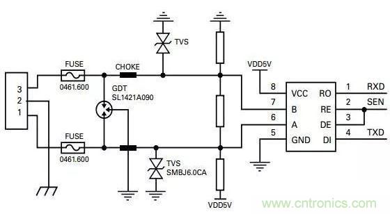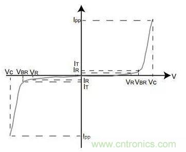 在智能仪表行业里一般采用RS-485通讯。下图所示为RS-485通讯接口的典型应用。在保护RS-485接口不被静电或者浪涌损坏通常用SMBJ5.0CA来做接口?;と缦峦?所示,当静电或者浪涌电压高于5V时,SMBJ5.0CA会开始动作,将电压钳位在很低的位置,如果电流超过了峰值电流IPP话,最终电压会被钳位在9V左右,从而保护了后一级的器件不被损坏。