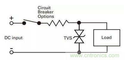 在实际的电路中,如图2所示,在DC input的时候,有时由于供电环境的变化会带来一些瞬时脉冲。而要消除瞬时脉冲对器件损害的最好办法,就是将瞬时电流从敏感器件引到地,一般具体做法是将TVS在线路板上与被?;は呗凡⒘U庋?,当瞬时电压超过电路正常工作电压后,TVS将发生雪崩击穿,从而提供给瞬时电流一个超低阻抗的通路,其结果是瞬时电流通过TVS被短路到GND,从而避开被?;て骷?,并且在电压恢复正常值之前使被保护回路一直保持截止电压。而当瞬时脉冲结束以后,TVS二极管再自动恢复至高阻状态,整个回路又回到正常电压状态。