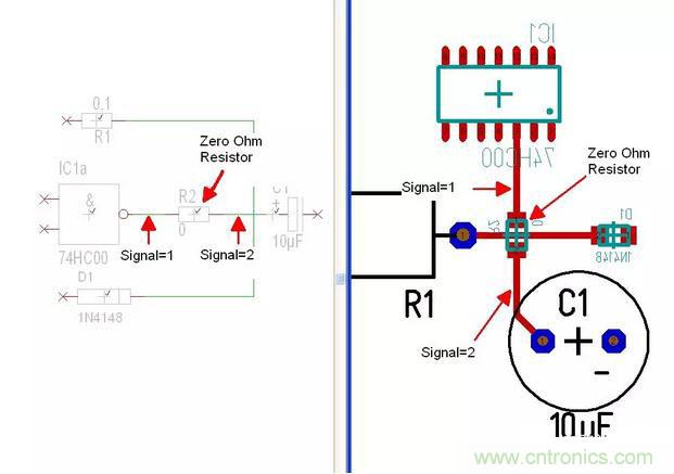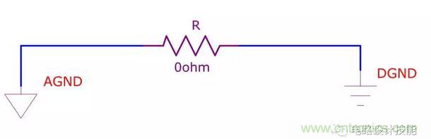 用于信号完整性的模拟地和数字地的单点连接 - 有人说0?跟没有一样,干嘛不直接连接上?想象一下如果你在电路原理图里没有这个0?的电阻,做PCB Layout的时候就可能忽略这个单点连接的原则,CAD软件也会乱连在一起,达不到你单点连接的初衷。当然单点连接的时候你也可以用磁珠,我个人的观点其实连接点的位置选择好的话,磁珠除了比电阻贵之外,没有什么好处,实际的操作中你可以用比较小的封装的0?电阻,比如0402、0201,焊接的时候直接用烙铁将两端搭接在一起就可以,连电阻也省了;