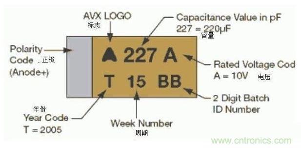 但是如果是贴片的钽电容或电解电容,会在表面有字母或数值标识。
