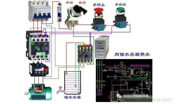 自动控制由传感器和控制执行机构组成。液位控制器的传感器一般是导线。利用水的导电性。水的导电性较差,不能直接驱动继电器。所以要有电子线路将电流放大,以推动继电器工作。继电器就是执行机构。