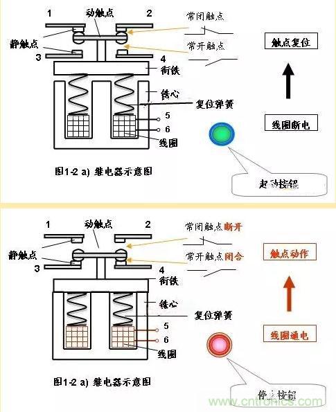 中间继电器就是个继电器,都是由固定铁芯、动铁芯、弹簧、动触点、静触点、线圈、接线端子和外壳组成。线圈通电,动铁芯在电磁力作用下动作吸合,带动动触点动作,使常闭触点分开,常开触点闭合;线圈断电,动铁芯在弹簧的作用下带动动触点复位。