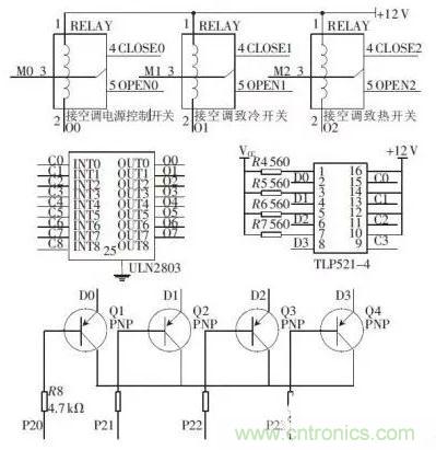 【导读】继电器开关??橛蒚LP521 -4 、ULN2803 和SRD -12VDC 及三极管构成,由微控制器输出的信号经过三极管构成的开关电路送往TLP521 -4 光耦芯片再通过ULN2803 达林顿管的放大后用来驱动SRD-12DC 继电器,进而达到控制空调的各种开关的作用。