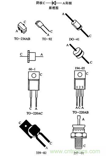 其它不同的封装用不同的图形表示。以辨认引脚,有少数几种印上肖特基二极管符号。虽然看不见标记,但是图8-24的194-05封装用了这种方法。TO-220AC封装有两个阴极引脚,其中金属片使两个阳极连通。引脚和金属片都可以用作肖特基二极管和电路连接端。而TO-220AB有两个阳极引脚。由于它内部有二个肖特基二极管,阳极有不同的端,但是内部两个阴极是连接在一起的。