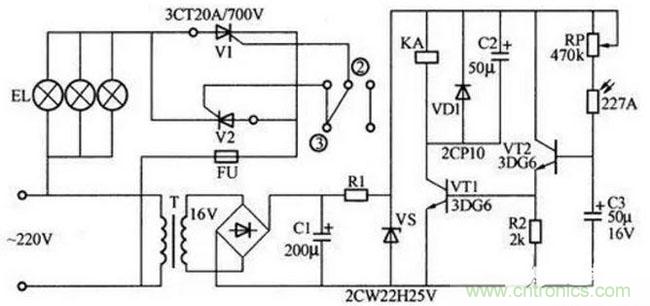 白天在较强光照下,光导管227A(一种光敏电阻)两端阻值很小,约20~50kΩ,晶体管VT2获得基极电流而导通,VT1从R2上得到正偏电压也导通,继电器线圈KA得电,继电器的常闭触电②、③断开,两只晶闸管V1和V2没有触发信号而不导通,因而灯泡EL不亮。