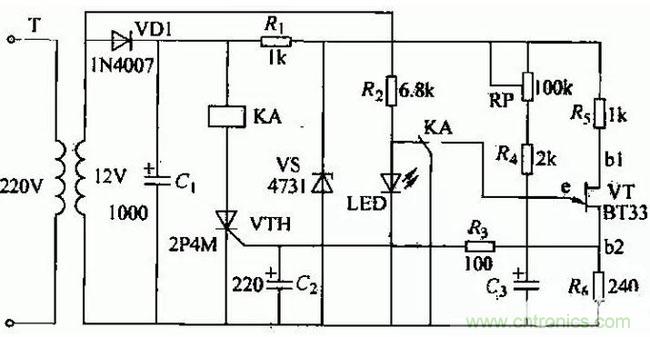 电容G上电压按指数规律逐渐升高,当此电压大于单结晶体管VT的峰点电压时,单结晶体管导通,G经VT的eb1极和风放电,在风上输出脉冲电压,触发藩闸管VTH导通使继电器KA吸合,KA的触头同时将C3短路,使之迅速放电,单结晶体管的ebl之间电压迅速下降,当降到Vr.的谷点电压时,Vr关闭。同时LED指示灯点亮。当切断电源时,继电器KA释放,电路恢复原始状态,等待下次动作。通过调节RP.可以调整延时时间。