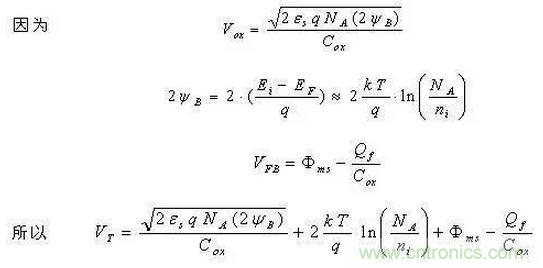 【答】E-MOSFET的阈值电压就是使半导体表面产生反型层(导电沟道)所需要加的栅极电压。对于n沟道E-MOSFET,当栅电压使得p型半导体表面能带向下弯曲到表面势ψs≥2ψB时,即可认为半导体表面强反型,因为这时反型层中的少数载流子(电子)浓度就等于体内的多数载流子浓度(~掺杂浓度);这里的ψB是半导体Fermi势,即半导体禁带中央与Fermi能级之差。阈值电压VT包含有三个部分的电压(不考虑衬偏电压时):栅氧化层上的电压降Vox;半导体表面附近的电压降2ΨB:抵消MOS系统中各种电荷影响的电压降——平带电压VF。