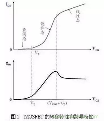 在VGS>VT时,出现沟道,但如果源-漏电压VDS=0,则不会产生电流;只有在VGS>VT和VDS>0时,才会产生电流,这时必然有VDS >(VGS-VT),因此MOSFET处于沟道夹断的饱和状态,于是源-漏电流随栅-源电压而平方地上升。相应地,饱和跨导随栅-源电压而线性地增大,这是由于饱和跨导与饱和电压(VGS-VT)成正比的缘故。